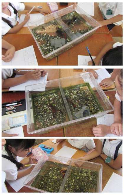 2年生の生活科の学習です。ざりがにの観察をしています。あたまのかたちやはさみの形など、しっかりと見て、観察カードに描いています。