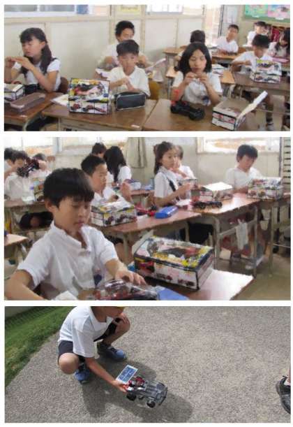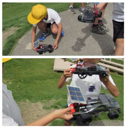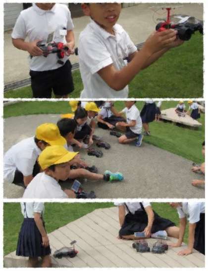 4年生の理科の学習です。モーターカーに光電池を乗せ、ソーラーカーにして走らせてみました。あいにくの曇りがちの空のため、あまり走ることはありませんでしたが、それでも時折射す日の光を受けて、モーターが動くと、太陽の光が動力源となることを理解することができました。