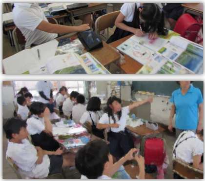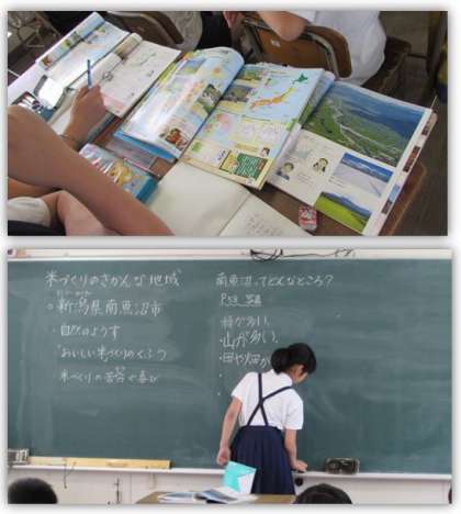 5年生の社会科の学習です。日本の米の生産がさかんな地域はどこか、資料を読み取って調べていきました。そして、南魚沼市の土地や気候の特色について調べ、米づくりとの関係を考えました。