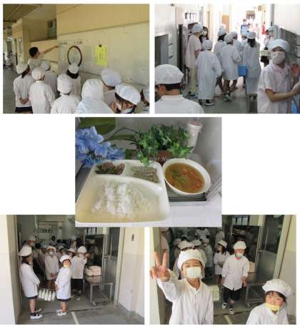 本日の給食の献立をご紹介します。本日の献立は、ご飯、いわし天ぷら、味噌汁、豚肉と三度豆の炒め物、牛乳でした。
