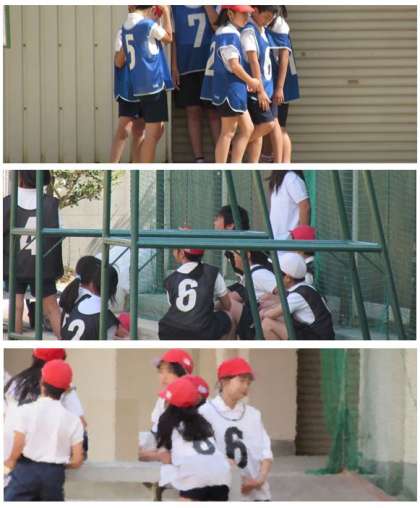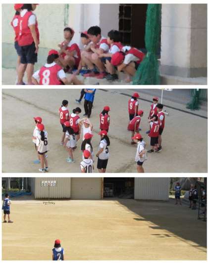 5年生の体育の学習です。運動場で、キックベースをしています。途中、チームで作戦も立てながら、ゲームを行いました。