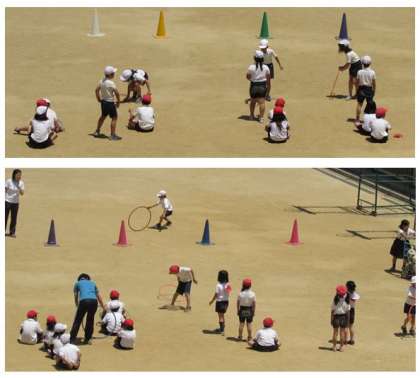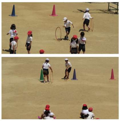 3年生の体育の学習です。輪を転がしてコーンを回ってくるリレーをしました。