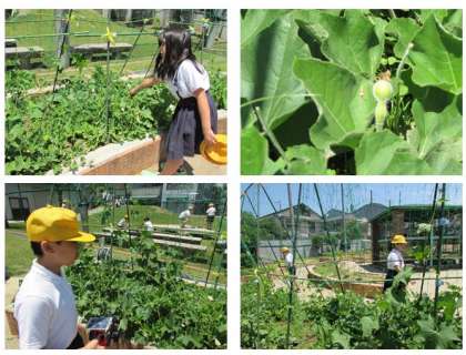 学習園に来た4年生の子どもたちは、自分たちが育てているヘチマやヒョウタンの様子を観察しました。ヒョウタンには白い花が咲き、その花の根元の部分が膨らんで小さなヒョウタンのようになっていることに気付きました。