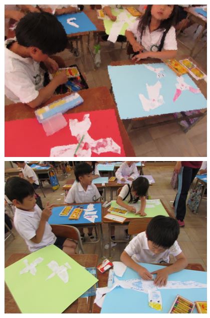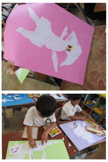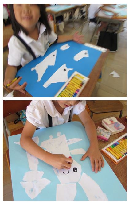 1年生の図画工作の学習です。無作為に紙をちぎり、その紙の形から想像して生き物を作りだしました。