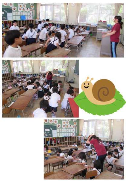 1年生の音楽の学習です。初めに「かたつむり」の歌に合わせ、かたつむりのように歩きながら歌いました。