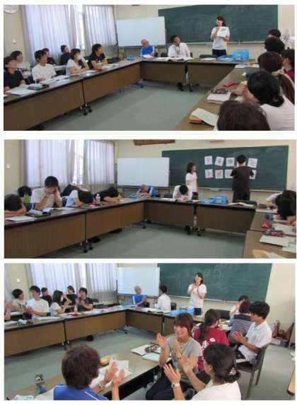 千本小学校でも、今年から英語のモジュール学習(毎週火曜日の朝)に取り組んでいます。本日はそのモジュール学習の良い教材として、カードを使ったゲームや歌遊びについて職員の研修を行いました。