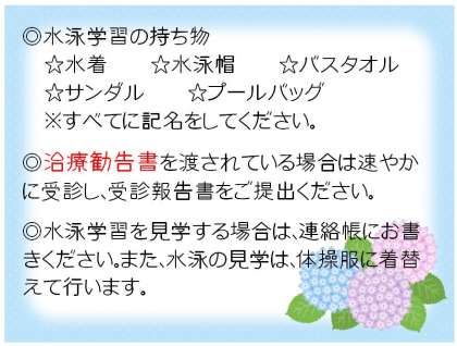 明日6月16日(金)は、1・2・3年生のプール開きです。天気予報では明日も晴れ、予想最高気温は29度、絶好のプール水泳日和になりそうです。子どもたちも、とても楽しみにしています。