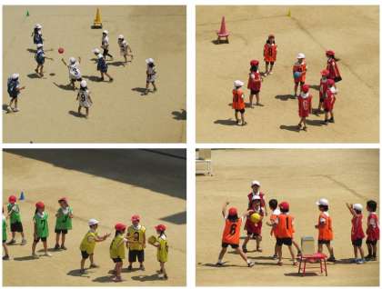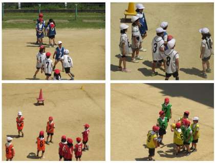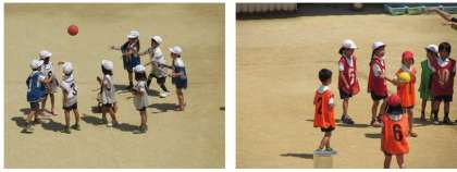 2年生の体育の学習です。チームに分かれ、的当てゲームを行っています。