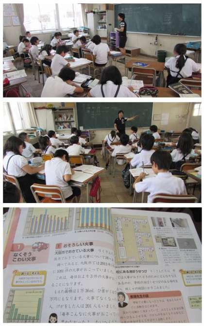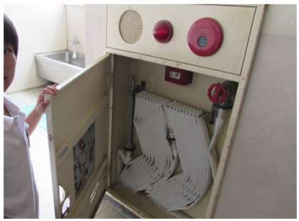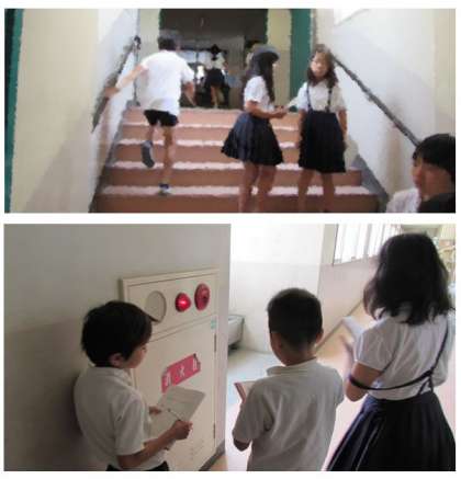 4年生の社会科の学習です。自分たちの学校では、学校を火事から守るためにどのような消防設備があるのだろうか、と考え、校内を調べました。そして、その配置図を作ることにしました。