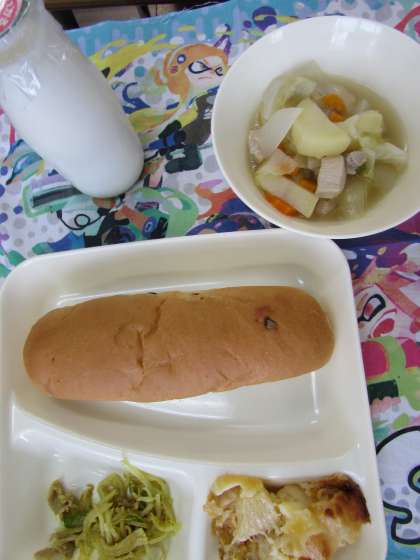 本日の献立は、レーズンパン、鶏肉と野菜のスープ煮、カレーソテー、ミックスフルーツのクラフティ、牛乳でした。