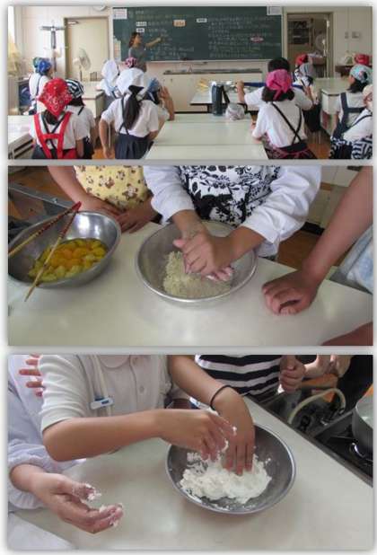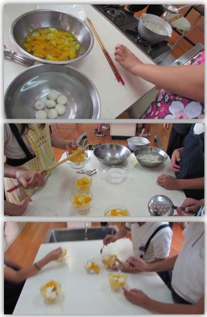 料理クラブでは、白玉フルーツポンチを作りました。白玉を作り、ミックスフルーツと混ぜ、サイダーを注いで完成です。