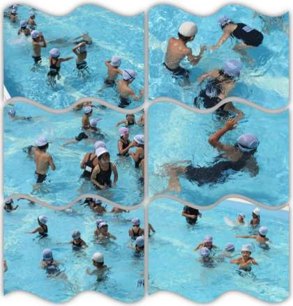 1年生の水泳学習です。楽しく水遊びをしています。画像は、「宝さがし」をしている場面です。水に潜って、宝を拾い集めます。