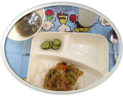 本日の献立は、和風カレーどんぶり、もずくとオクラのとろり汁、きゅうりの酢の物、牛乳でした。