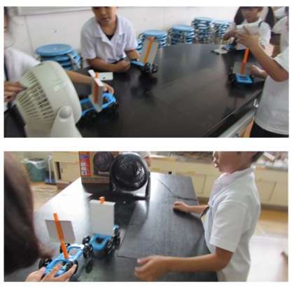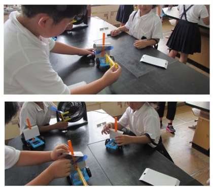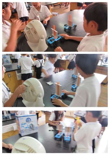 3年生の理科の学習です。送風機の風を当てて、車を動かしています。そして、車に当てる風の強さを変えて、車の動き方の違いを調べました。
