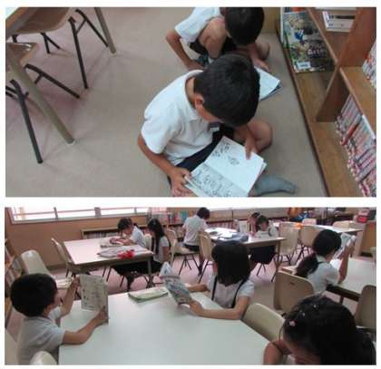 4年生の国語の学習です。図書館で本を読んでいます。カウンターでは、図書係がバーコードリーダーを使って図書の貸し出し・返却を行っています。