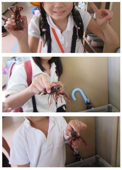 2年生は生活科の学習で、ザリガニの飼育・観察を行っています。手でさわれるぐらいにまで、お友達になれました。