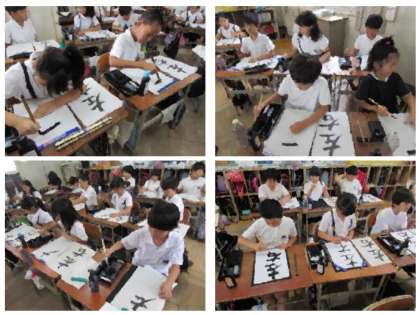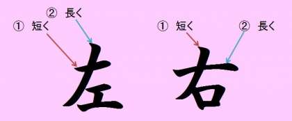 4年生の国語の学習です。毛筆書写で「左右」です。「左」と「右」では、最初の2画の筆順が違い、そのために画の長さが違ってくるということを意識して、書きました。