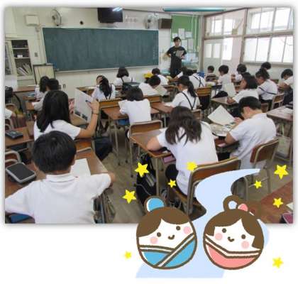 画像は、5年生の朝の会の様子です。担任の先生と一緒に、学級通信を読んでいます。