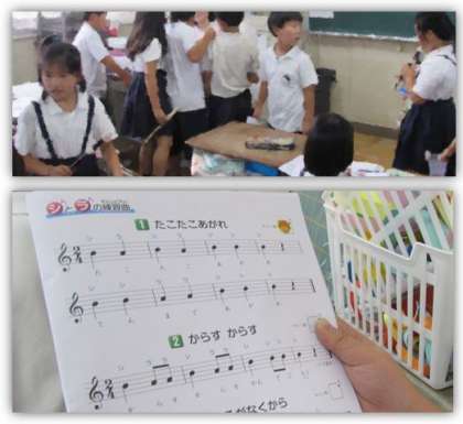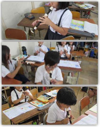 3年生の音楽の学習です。リコーダーで『たこたこあがれ』が吹けるよう、練習しています。吹けるようになった子は、先生に聞いてもらうため、並んでいます。