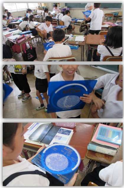 4年生の理科の学習です。この単元では「星の明るさや色には違いがあること」や「星の集まりに名前を付けたものを星座ということ」を学習します。今日は星座早見を手にして、子どもたちもわくわくしています。