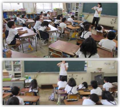 2年生の国語の学習です。授業の初めに、フラッシュカードを使って、漢字の読みを繰り返します。先生がカードをめくると、子どもたちは素早くこたえます。