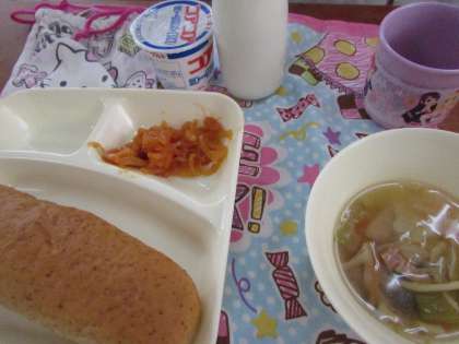本日の給食の献立をご紹介します。本日の献立は、ライ麦パン、えびのチリソース、中華スープ、ヨーグルト、牛乳でした。