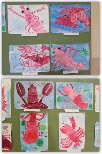 2年生の図画工作の学習です。ザリガニの絵を描きました。真っ赤なはさみをふり上げ、今にも飛び出してきそうな大きなザリガニが描けました。