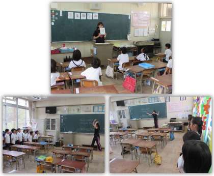 画像は、1年生の様子です。英語のカードを見ながら先生の後について発声したり、英語の歌に合わせて元気に体を動かしたりしています。