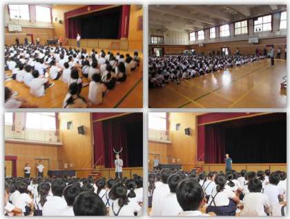 今回は、西成警察防犯係の方にご協力いただき、校内に不審者が侵入した、という想定で、行いました。訓練と分かっていても、校内放送を聞いて子どもたちに緊張が走ります。侵入者がおさえられた、との放送で、子どもたちは講堂に移動しました。講堂では、西成警察の方に、「知らない人にはついていかない」「知っている人でも、おうちの人の許しが無ければついていかない」というお話をしていただきました。また、道を尋ねられたりしても、その場から移動してついていくということがないように、との話もありました。