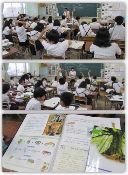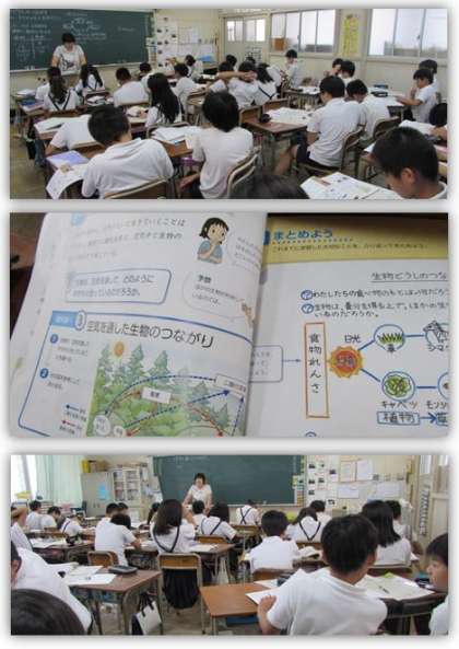 6年生の理科の学習です。生き物と食べ物、空気、水との関わりについて考えました。そして、動物には、植物を食べて生きているものがいること、その動物もほかの動物に食べられることがあることなど、生き物には「食べる」「食べられる」という関係があることを調べました。