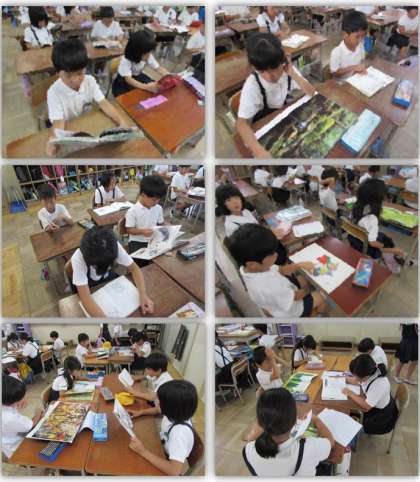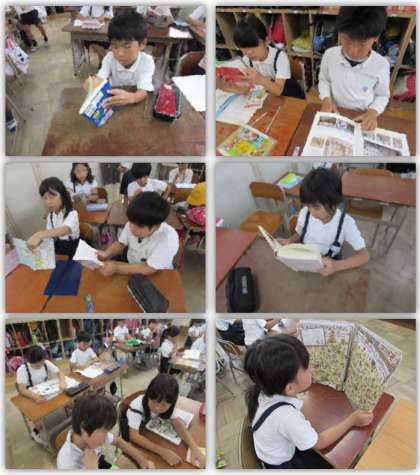 水曜日の朝、読書タイムの様子です。子どもたちは各自、1冊の本を選び、静かに読書をします。