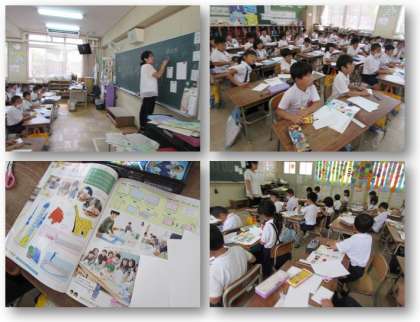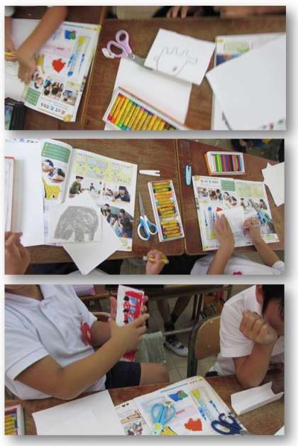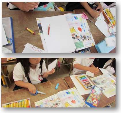 1年生の図画工作の学習です。紙を切ったり折ったりして、立つものを作りました。