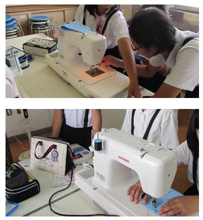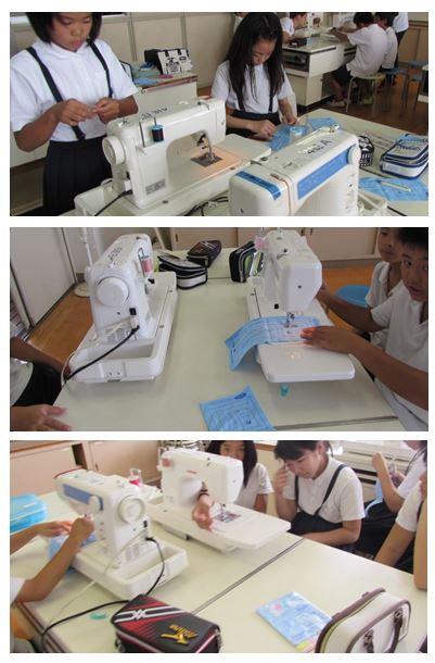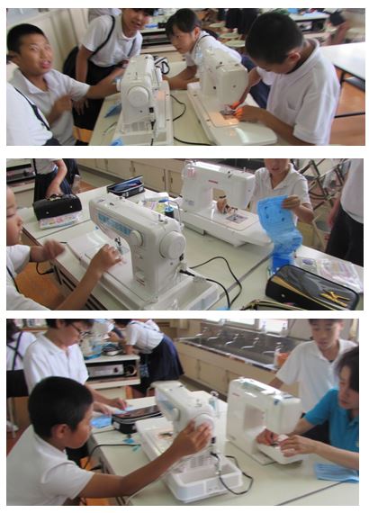 5年生の家庭科の学習です。ミシンを使って、直線縫いの練習をしました。