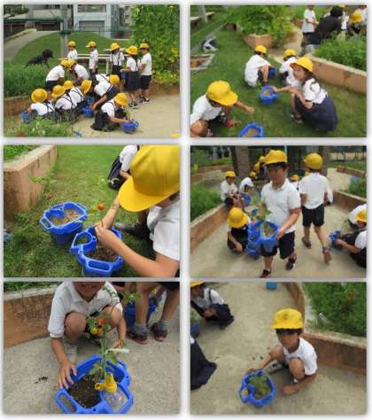 2年生の生活科の学習です。学習園に行き、ミニトマトの観察をしました。赤い実がつき始めました。子どもたちは「食べたいな」と、つぶやいていました。