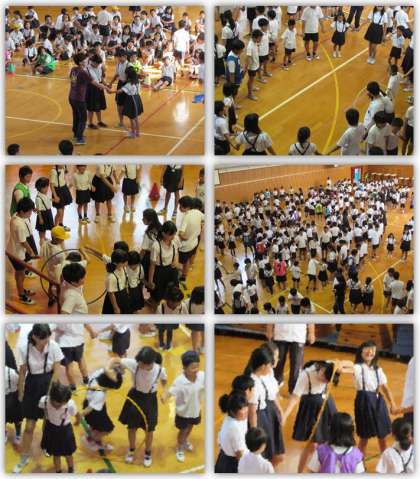 木曜日の朝、児童集会の様子をご紹介します。今日の集会は、集会委員会による『フラフープくぐり』です。班全員で手をつないで輪になり、フラフープを送っていきます。3分間で、何周できるかを競いました。とても楽しいゲームでした。
