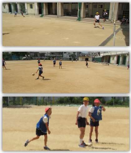 今日、大阪市は最高気温が34度、湿度も高く、非常に蒸し暑い日となりました。それでも子どもたちは元気に運動場で活動しています。