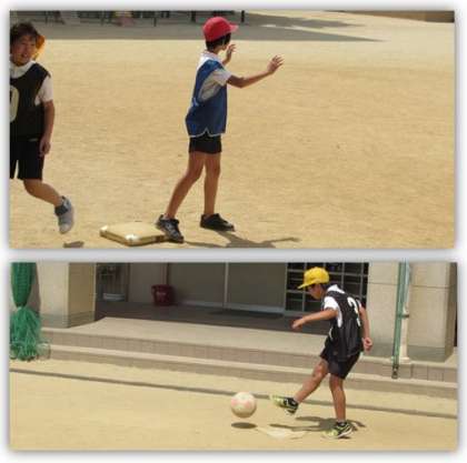 5年生の体育です。キックベースをしています。