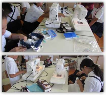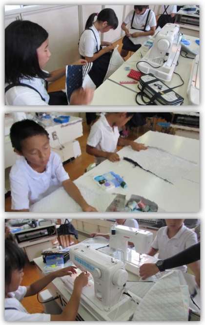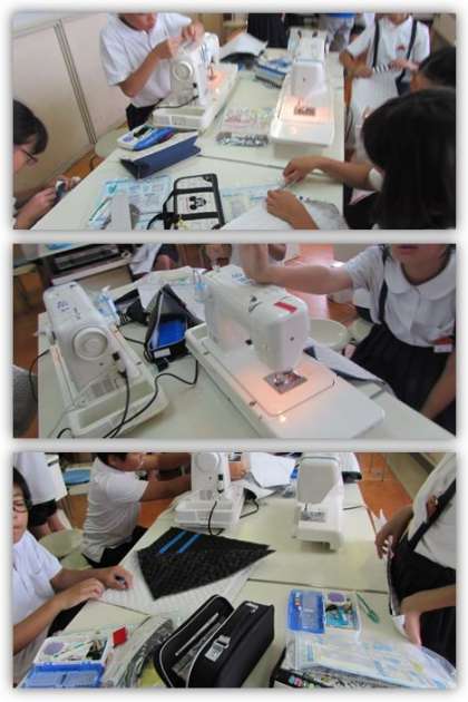 5年生の家庭科の学習です。家庭科室に行き、ミシンを使ってナップサックを仕上げています。
