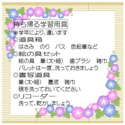 夏休み前、学習用具も持ち帰ります。学年により持ち帰るものは違いますが、持ち帰った学習用具は中身を点検し、使い切ってしまっているもの、あるいは残りが少なくなっているものなどありましたら、補充をお願いいたします。また、ノートの残りも点検しておいてください。