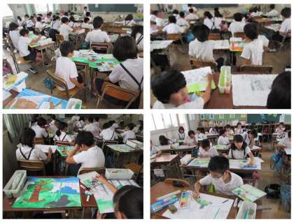 6年生の図画工作の学習です。描いた校内の絵に、絵の具で彩色していきました。