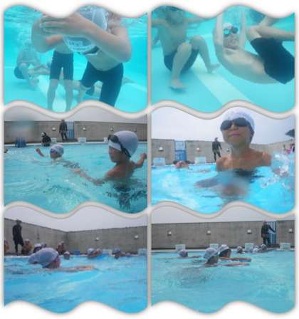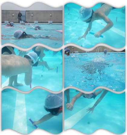 1・2年生のプール開放の様子です。ビート板を持って、け伸びの練習をしています。