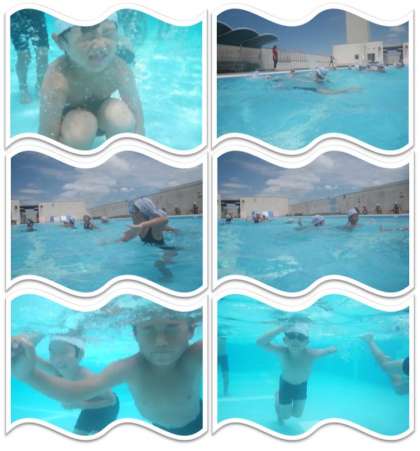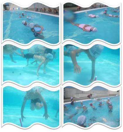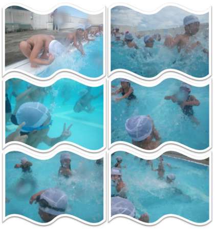 1・2年生のプール開放の様子です。水中かけっこや「潜水艦」「カニさん歩き」「イルカジャンプ」「ラッコ浮き」などの水慣れの運動を楽しみました。最後には、1年生対2年生で宝探しをしました。