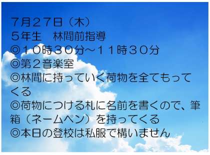 本日、5年生の林間前指導を行います。林間学習に持っていく荷物をすべて持って、登校しましょう。10時30分より1時間、第2音楽室で行います。