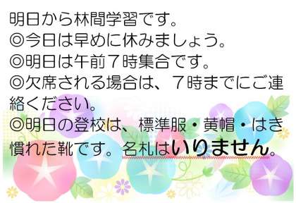 ◎明日の登校は、標準服・黄帽です。名札はいりません。