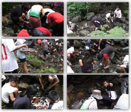 焼き板工作その1です。清流の中で、板のすすを落としていきます。しびれるような水の冷たさに、初めは悲鳴も上がりましたが、やがて皆、夢中になってすす落としに励みました。