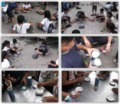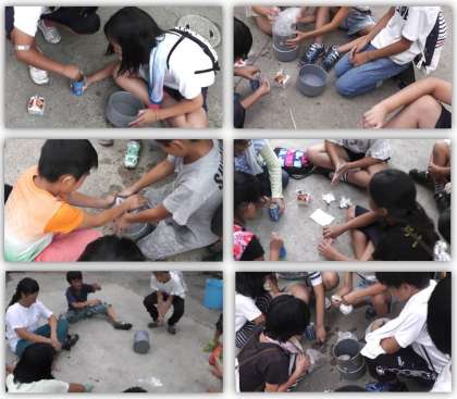 アイスクリーム作りです。容器に、材料を入れた缶と、氷・食塩を入れ、30分間転がします。30分経って缶を開けると、中にはアイスクリームができていました。冷たくて、とてもおいしかったです。