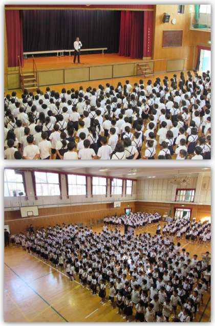 続いて、生活指導担当の先生の話です。夏休み前に話した、「遊びに行くとき、いつ、どこで、だれと遊ぶ」ということを、おうちの人に伝えることができていましたか、生活のリズムを整え、2学期も頑張りましょう、という話をしました。