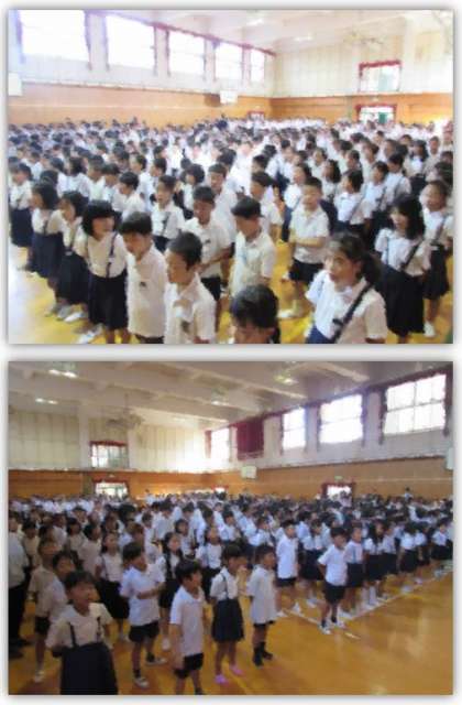 始業式の様子です。初めに学校長の話です。『みなさん、元気に登校してきましたね。工作や絵を持って登校してくる人たちを見ました。皆さんの作品を見るのを楽しみにしています』『2学期には、運動会や学習発表会、6年生は修学旅行など、行事があります。一つ一つの活動を、何気なくこなしていくのではなく、自分なりのめあてをもって取り組みましょう』