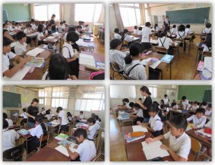 5年生は2学期から、学年(2クラス)を3分割して国語・算数の学習を行います。画像は、算数の学習の様子です。初めに、宿題の答え合わせをしています。