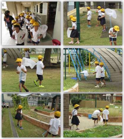 1年生の生活科の学習です。学習園に行き、秋の生き物を探しました。大きな虫とり網を持っていきましたが、どんな生き物が見つかったのでしょうか。